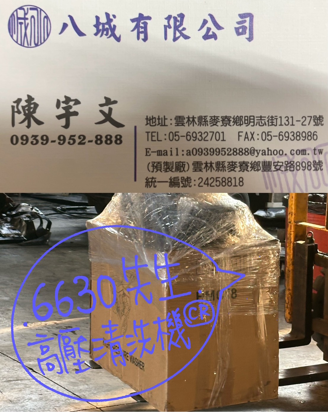 感謝「八城有限公司 陳老闆」宅配 續購 下訂15HP高壓清洗機