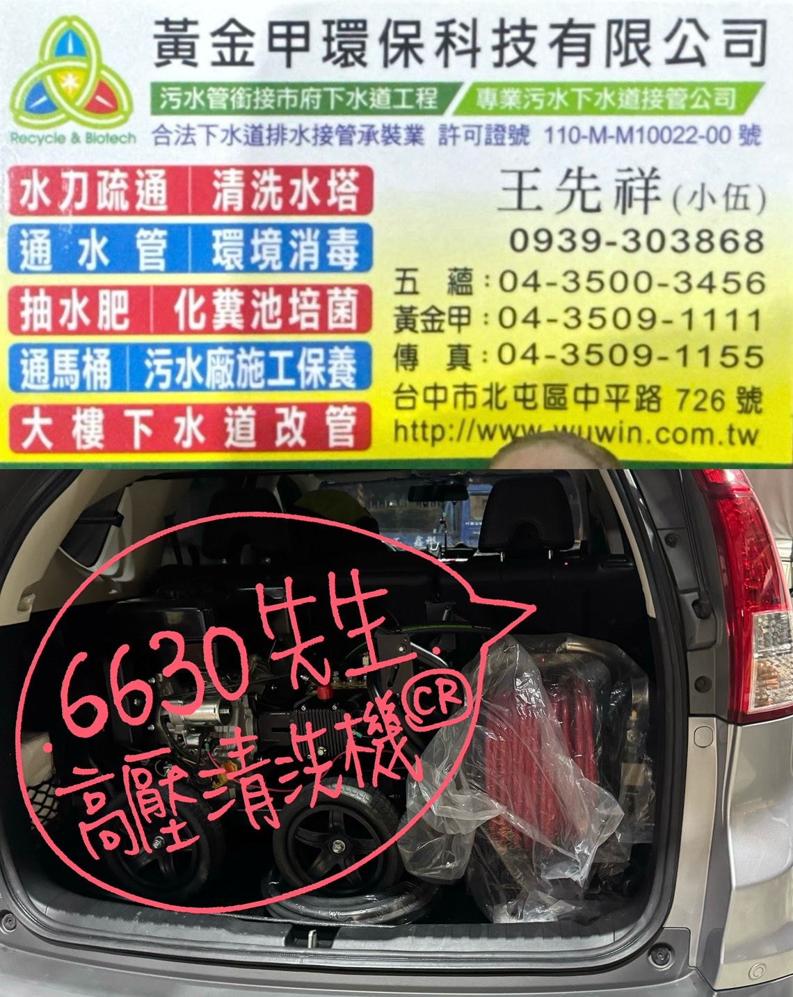 感謝「黃金甲環保科技有限公司 王老闆」面交 下訂15HP高壓清洗機